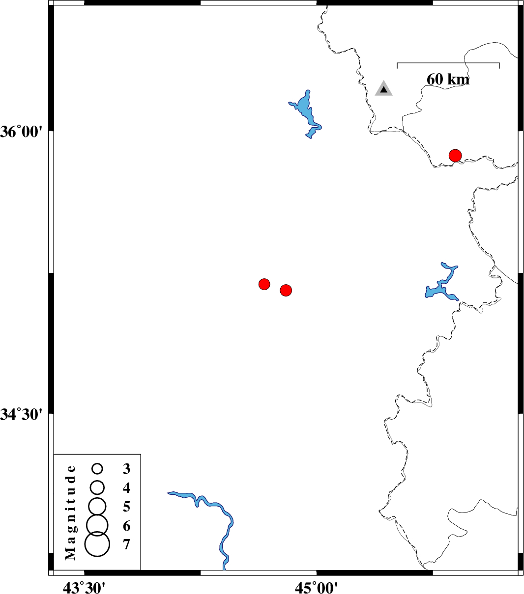 | 2024/02/15 | 12:39:21.9 | 16:09:21.9 | 35.189 | 44.661 | 10 | ML:3.3 | Iraq, 82 km South-West of Sulaymaniyah | ||