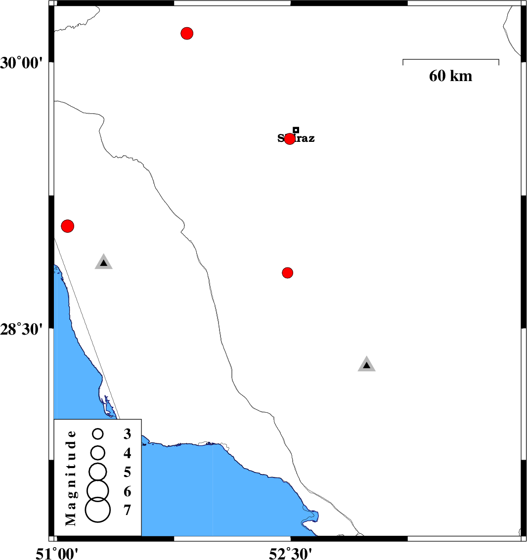 | 2024/01/31 | 03:29:54.8 | 06:59:54.8 | 29.569 | 52.493 | 8 | ML:3.3 | Fars Province, 7 km of Shiraz |