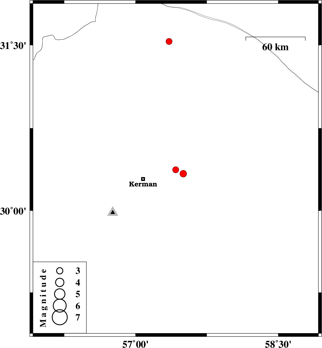 | 2024/02/09 | 14:56:33.2 | 18:26:33.2 | 30.336 | 57.502 | 7 | ML:3.2 | Kerman Province, 41 km -East of Kerman |