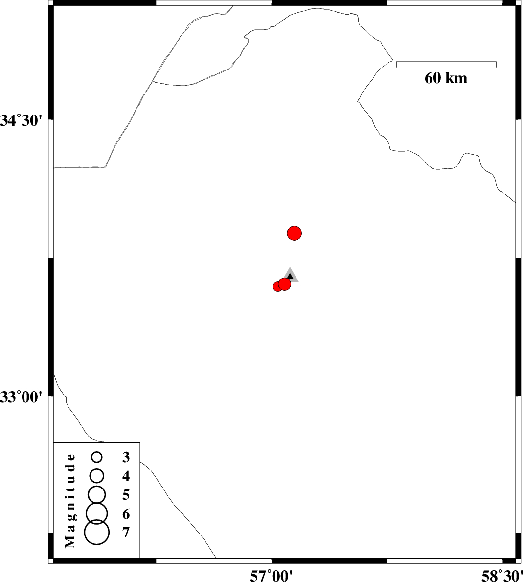 | 2024/02/28 | 17:49:52.6 | 21:19:52.6 | 33.887 | 57.147 | 12 | ML:4.2 | Khorasan(center) Province, 38 km North-East of Tabas | ||