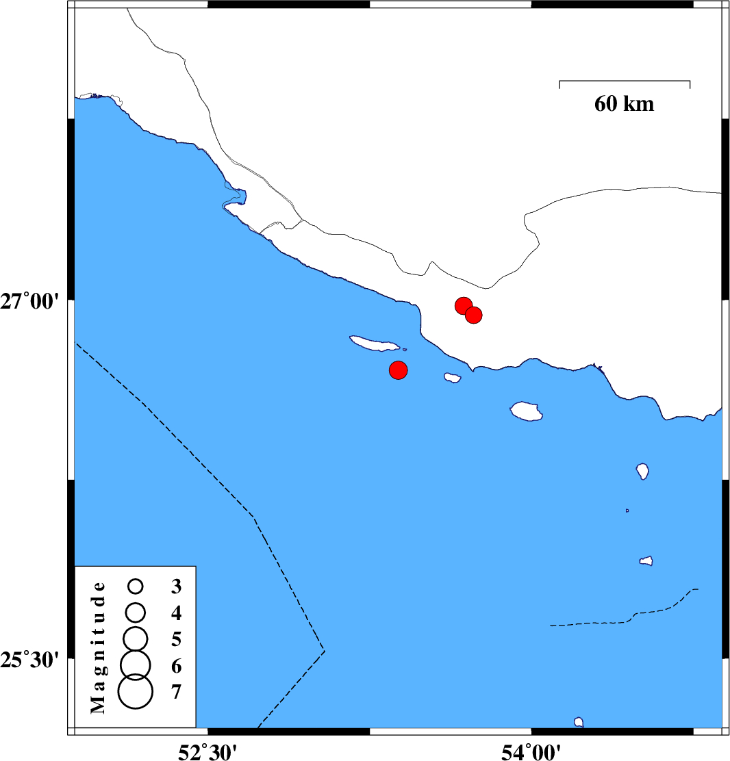 | 2024/03/06 | 15:46:49.0 | 19:16:49.0 | 26.707 | 53.382 | 12 | ML:3.8 | Persian Gulf, 73 km South-East of Lamerd | ||