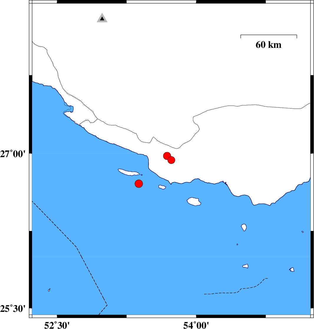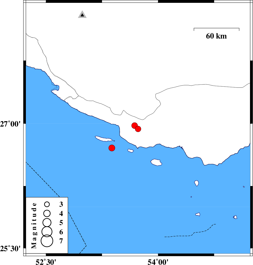 | 2024/03/06 | 15:46:49.0 | 19:16:49.0 | 26.707 | 53.382 | 12 | ML:3.8 | Persian Gulf, 73 km South-East of Lamerd | ||