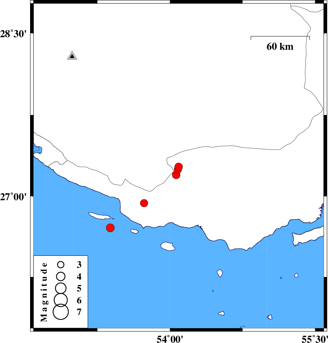 | 2024/03/06 | 15:46:49.0 | 19:16:49.0 | 26.707 | 53.382 | 12 | ML:3.8 | Persian Gulf, 73 km South-East of Lamerd | ||