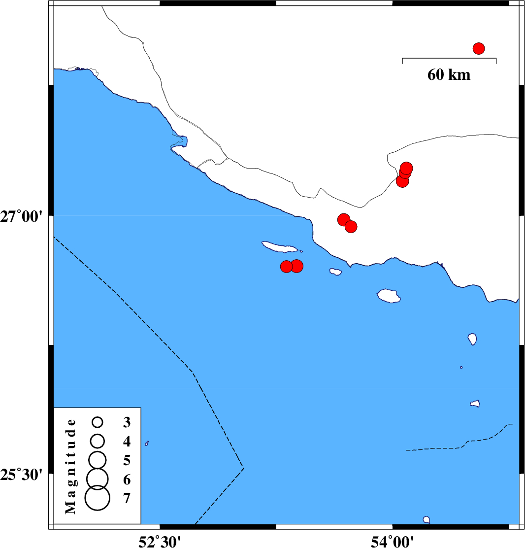 | 2024/03/06 | 15:46:49.0 | 19:16:49.0 | 26.707 | 53.382 | 12 | ML:3.8 | Persian Gulf, 73 km South-East of Lamerd | ||