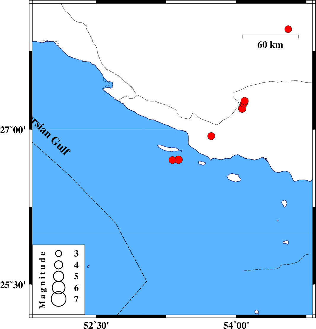 | 2024/03/06 | 15:46:49.0 | 19:16:49.0 | 26.707 | 53.382 | 12 | ML:3.8 | Persian Gulf, 73 km South-East of Lamerd | ||