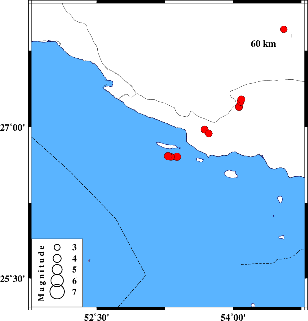 | 2024/03/06 | 15:46:49.0 | 19:16:49.0 | 26.707 | 53.382 | 12 | ML:3.8 | Persian Gulf, 73 km South-East of Lamerd | ||