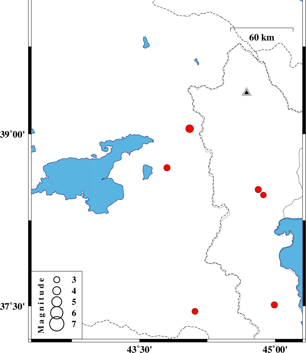 | 2024/03/25 | 10:43:51.9 | 14:13:51.9 | 38.709 | 43.803 | 12 | ML:3.3 | Turkey, 66 km South-West of Seyah Cheshmah | ||