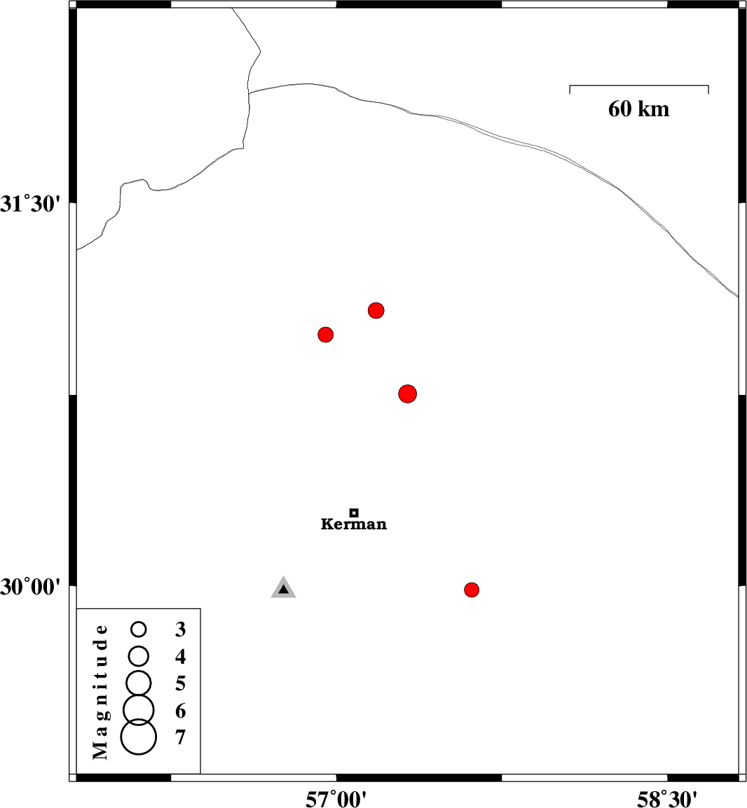 | 2024/03/30 | 16:07:20.3 | 19:37:20.3 | 30.754 | 57.322 | 8 | ML:3.7 | Kerman Province, 57 km North-East of Kerman | ||