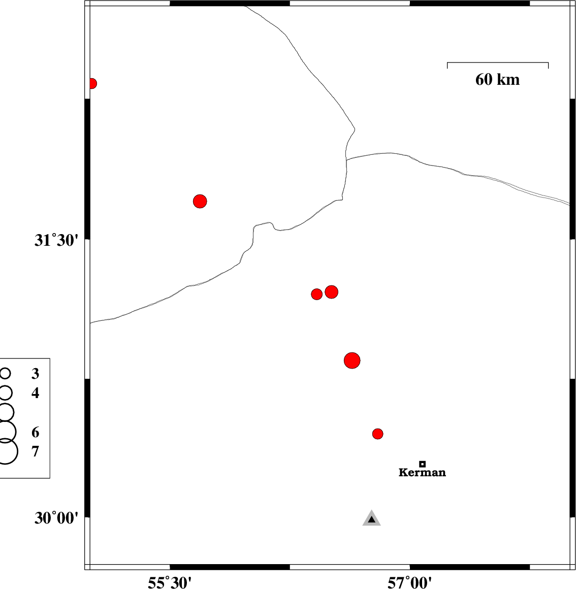 | 2024/03/26 | 07:04:33.2 | 10:34:33.2 | 29.984 | 57.612 | 8 | ML:3 | Kerman Province, 61 km South-East of Kerman |