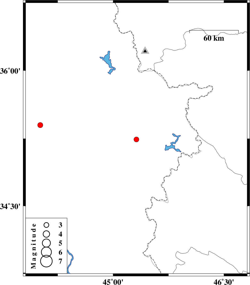| 2024/04/27 | 00:35:06.8 | 04:05:06.8 | 35.241 | 45.315 | 9 | ML:3.1 | Iraq, 37 km South-West of Sulaymaniyah |