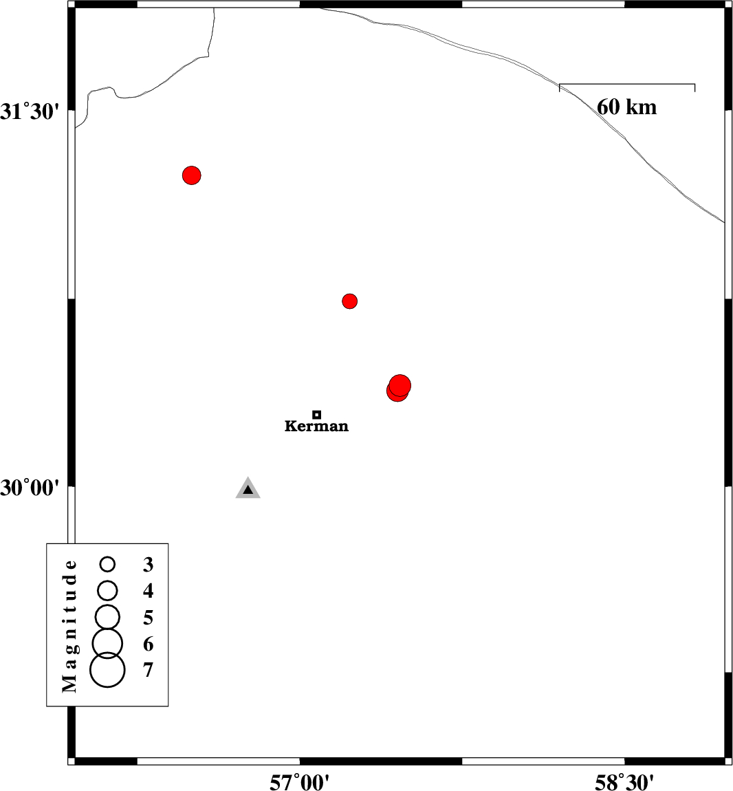 2024/05/01 | 13:34:00.4 | 17:04:00.4 | 30.404 | 57.462 | 12 | ML:4.5 | Kerman Province, 39 km North-East of Kerman | ||