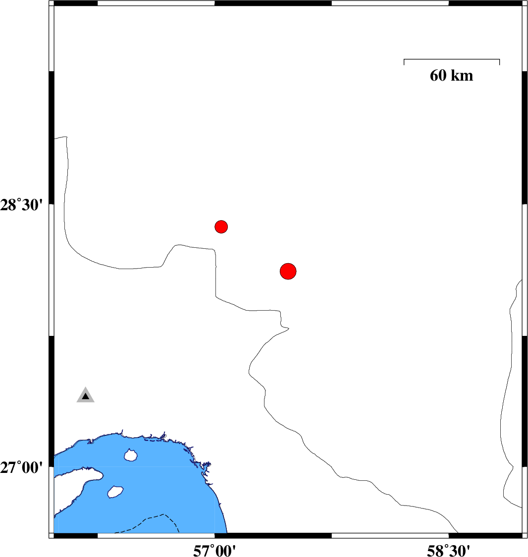 2024/05/02 | 04:23:45.8 | 07:53:45.8 | 28.118 | 57.47 | 10 | ML:4.6 | Kerman Province, 29 km North-West of Kahnuj | ||