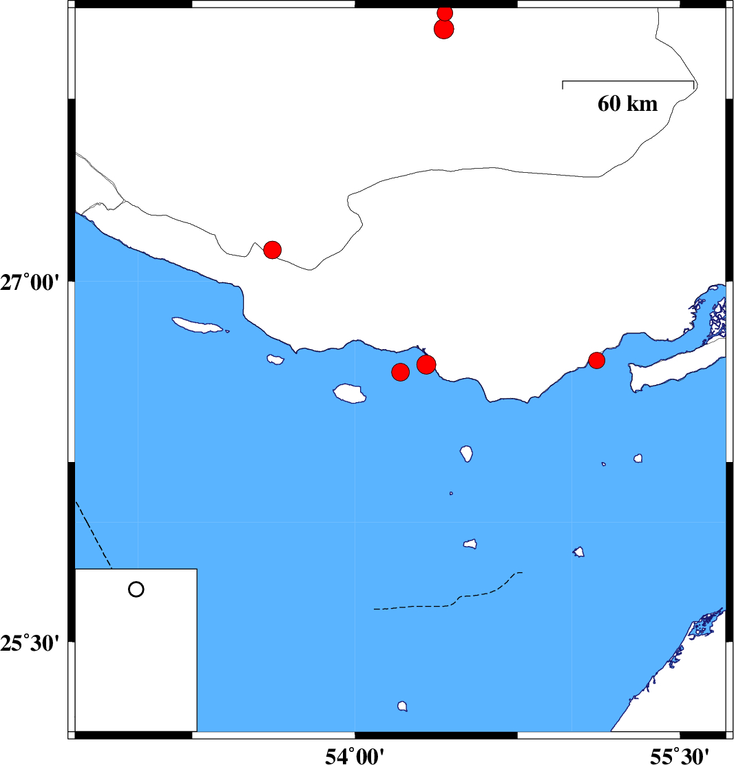 2024/04/06 | 04:54:51.5 | 08:24:51.5 | 26.655 | 54.329 | 12 | ML:3.9 | Persian Gulf, 60 km South of Bastak | ||