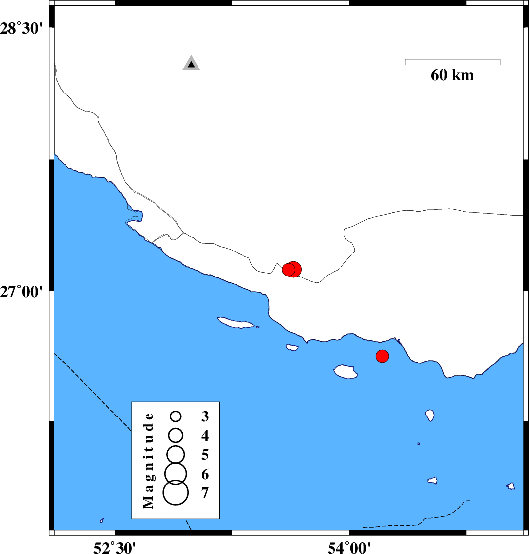 2024/05/11 | 11:30:17.6 | 15:00:17.6 | 27.122 | 53.611 | 18 | ML:3.6 | Fars Province, 50 km South-East of Lamerd | ||