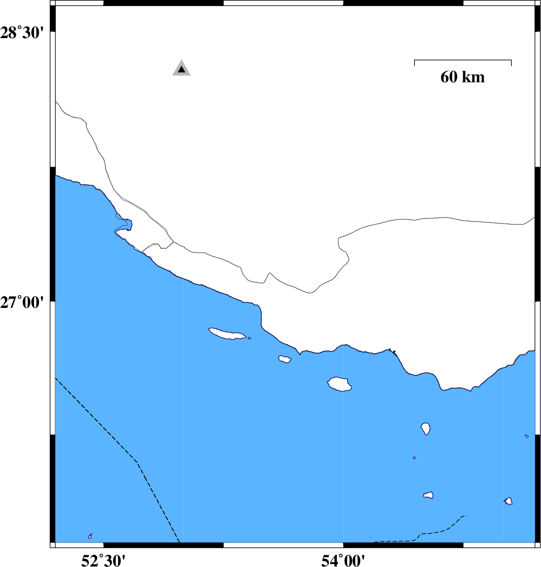 | 2024/05/23 | 17:07:31.1 | 20:37:31.1 | 27.168 | 53.679 | 16 | ML:5.1 | Fars Province, 54 km South-East of Lamerd | ||