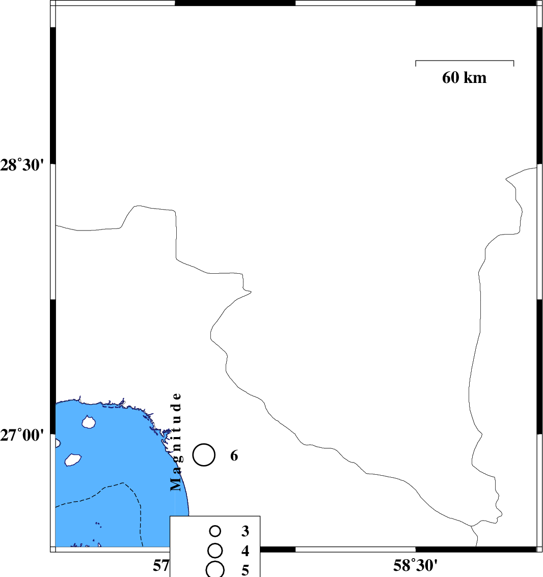 | 2024/05/24 | 10:33:31.9 | 14:03:31.9 | 27.868 | 57.755 | 6 | ML:4 | Kerman Province, 11 km of Kahnuj |