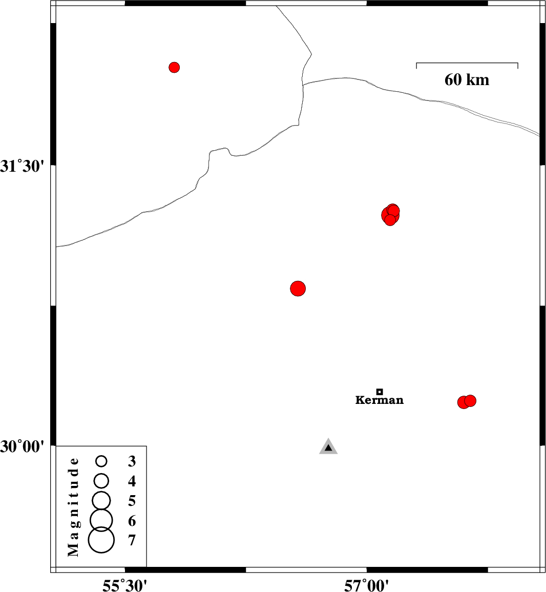 | 2024/05/30 | 01:07:45.4 | 04:37:45.4 | 31.233 | 57.146 | 16 | ML:4.9 | Kerman Province, 32 km -East of Ravar | ||