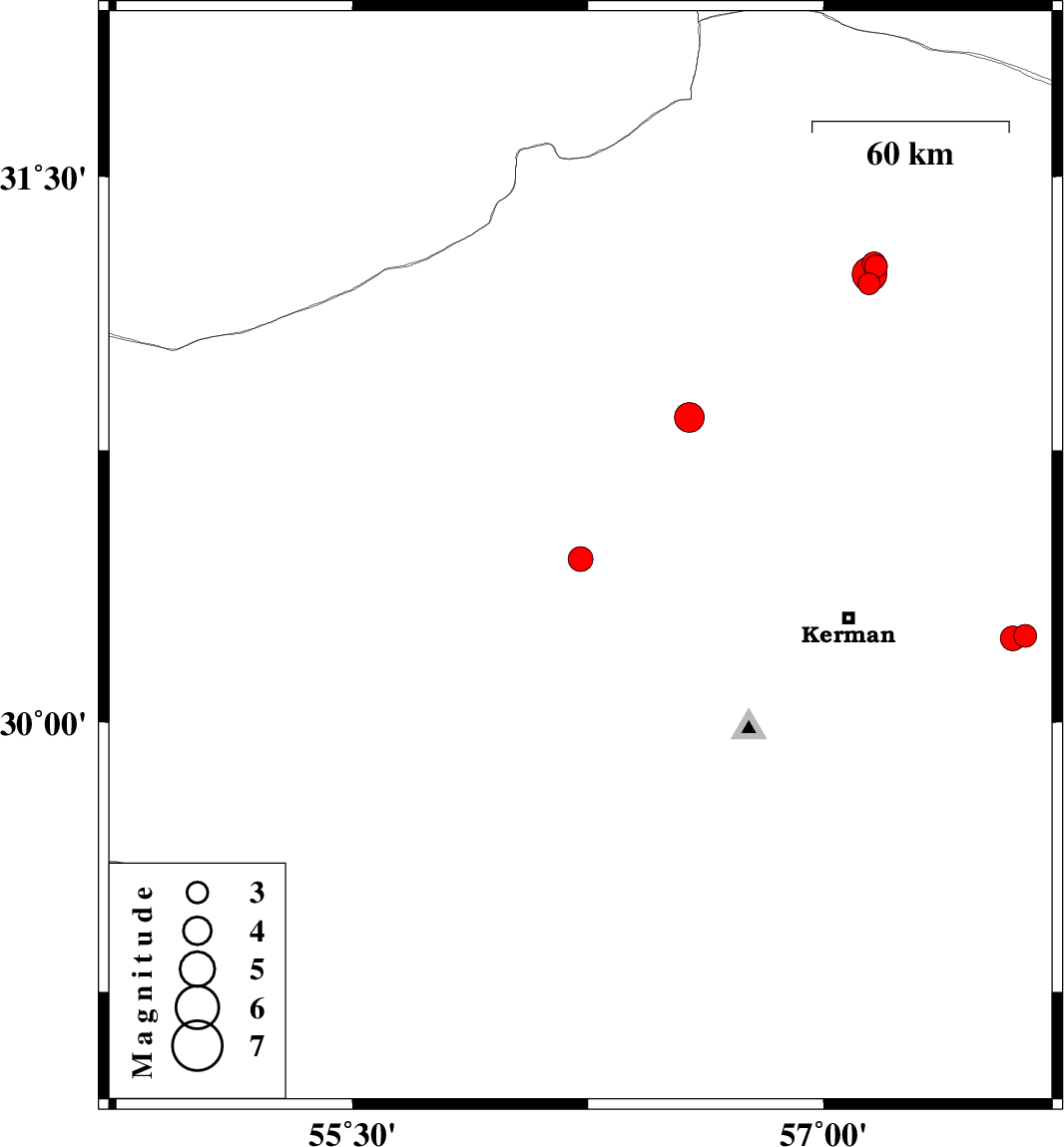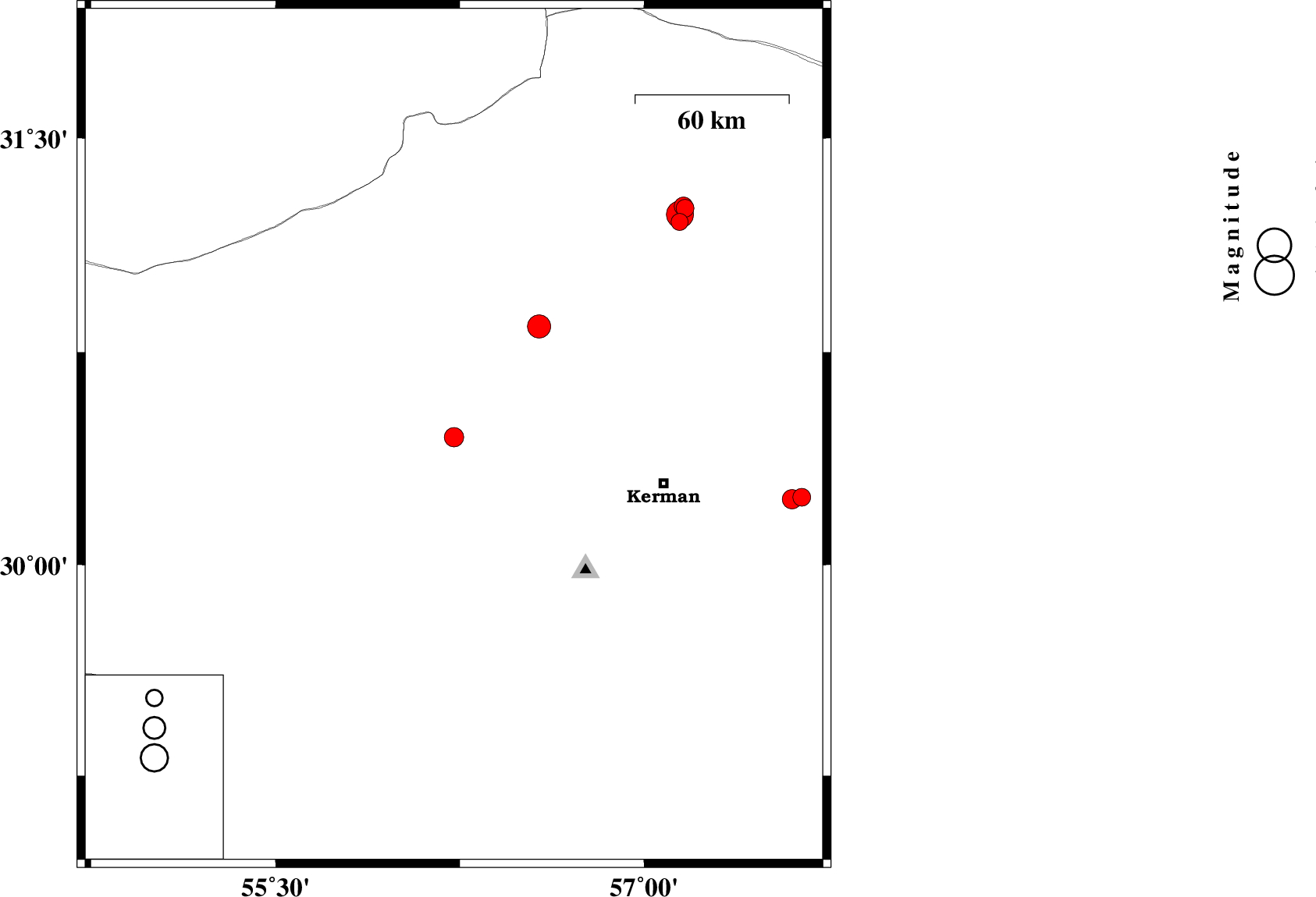 | 2024/05/30 | 01:07:45.4 | 04:37:45.4 | 31.233 | 57.146 | 16 | ML:4.9 | Kerman Province, 32 km -East of Ravar | ||