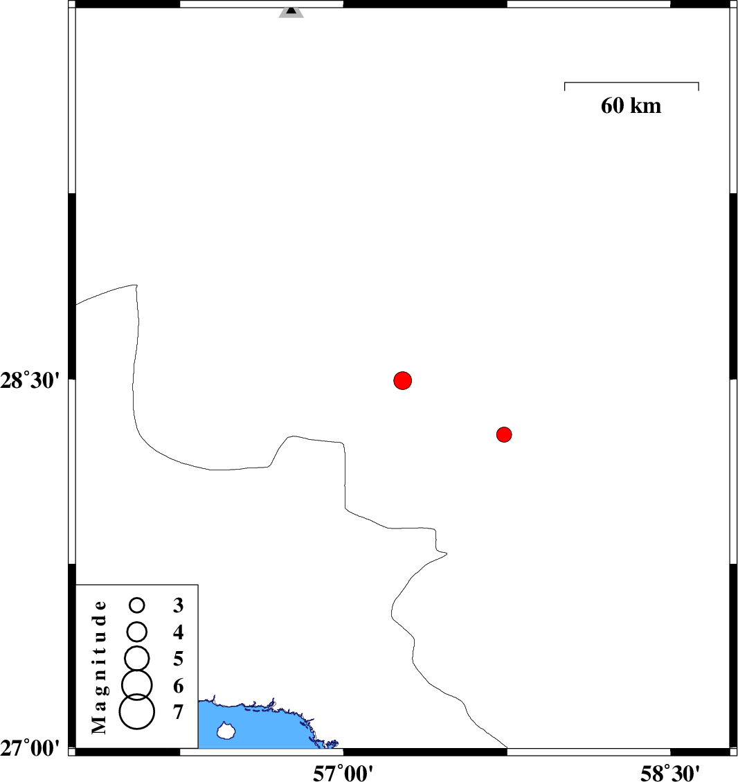 | 2024/06/16 | 09:25:57.5 | 12:55:57.5 | 28.275 | 57.736 | 9 | ML:3.1 | Kerman Province, 36 km North of Kahnuj | ||