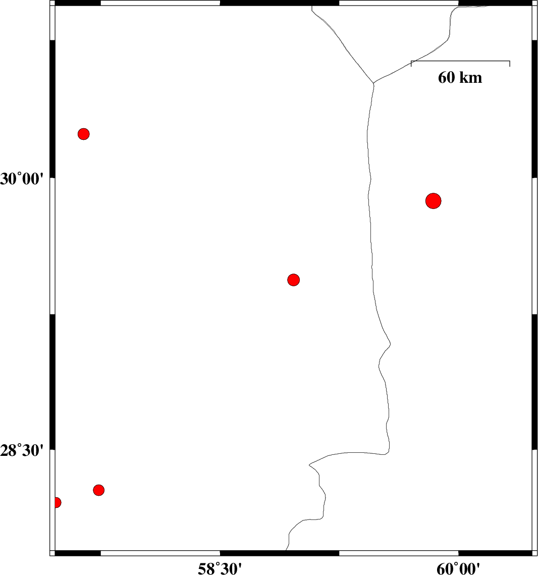 | 2024/06/28 | 22:54:04.0 | 02:24:04.0 | 29.438 | 58.962 | 14 | ML:3.4 | Kerman Province, 69 km North-East of Bam | ||