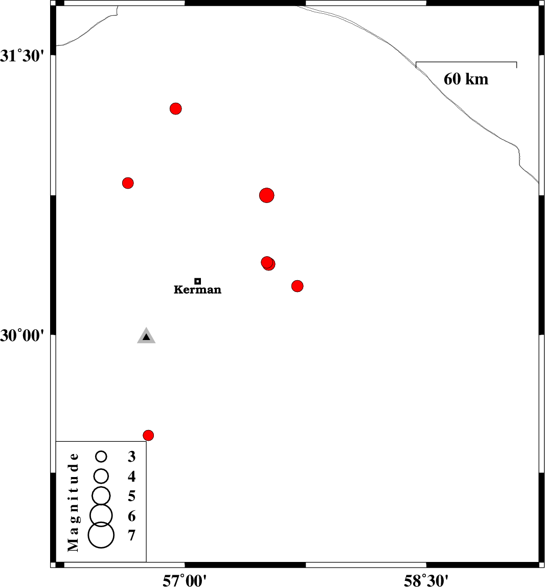 2020/08/05 | 18:55:03.8 | 23:25:03.8 | 30.749 | 57.507 | 12 | ML:4.1 | Kerman Province, 66 km North-East of Kerman |