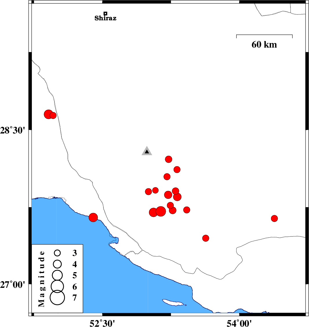2020/08/25 04:41:20.7 09:11:20.7 27.44853.63212 ML:3.2 Fars Province, 48 km North-East of Lamerd