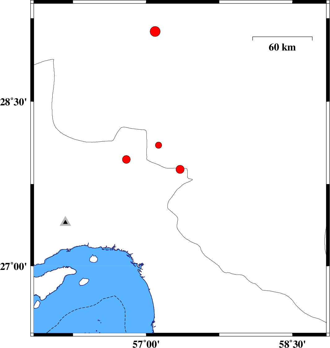 | 2024/07/19 | 23:42:06.9 | 03:12:06.9 | 27.884 | 57.348 | 20 | ML:3.8 | Hormozgan Province, 35 km -West of Kahnuj | ||