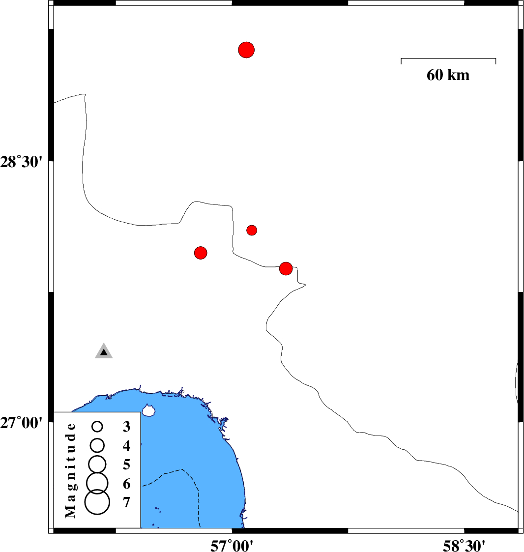 | 2024/07/17 | 18:59:05.7 | 22:29:05.7 | 28.103 | 57.127 | 12 | ML:3 | Kerman Province, 58 km North-West of Kahnuj | ||