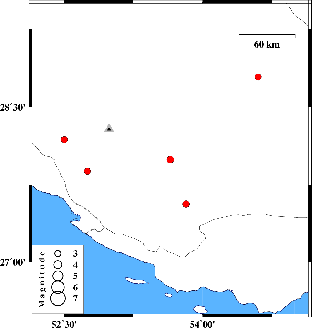 | 2024/07/17 | 03:09:47.1 | 06:39:47.1 | 27.993 | 53.65 | 12 | ML:3.5 | Fars Province, 57 km South of Jahrom | ||