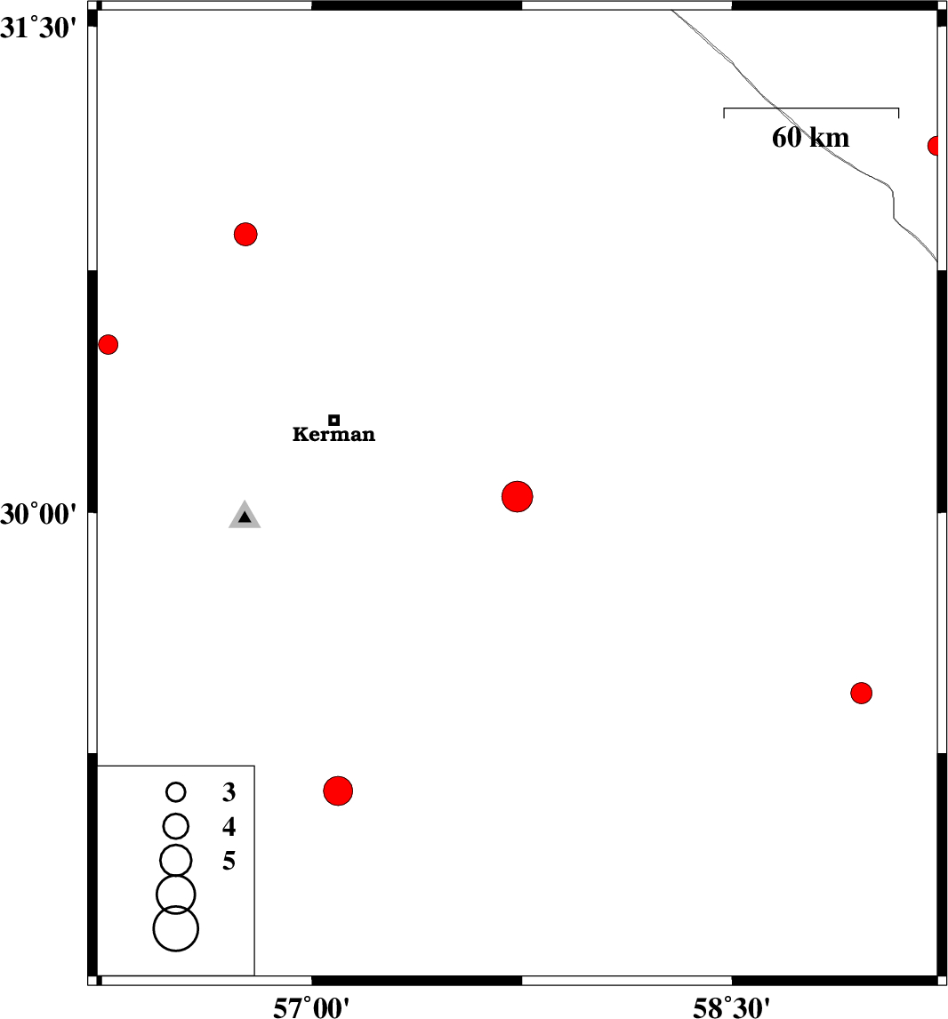 | 2024/06/20 | 05:11:53.1 | 08:41:53.1 | 30.521 | 56.273 | 12 | ML:3.1 | Kerman Province, 30 km North-East of Rafsanjan |