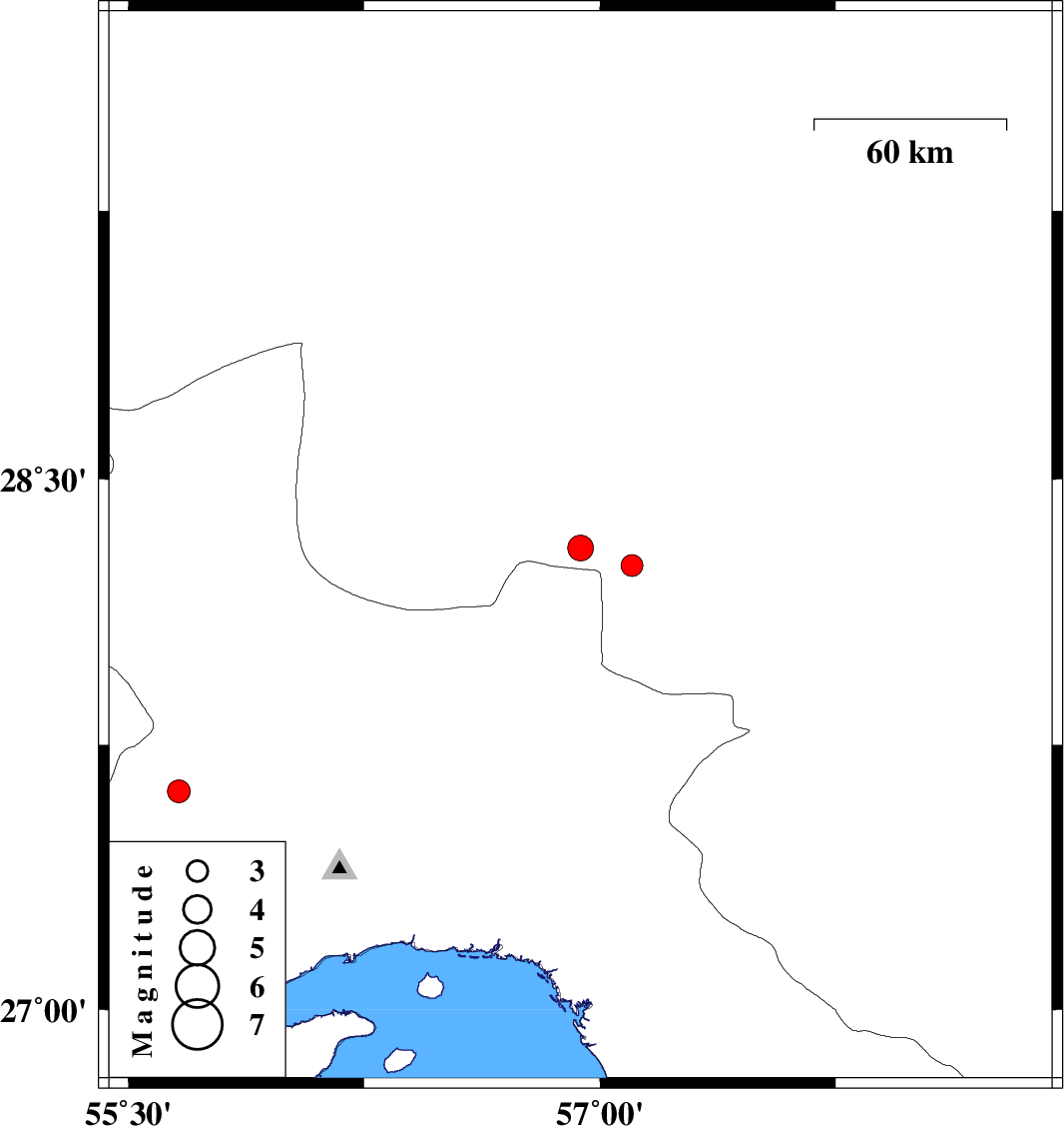 | 2020/08/27 | 21:42:28.4 | 02:12:28.4 | 27.619 | 55.66 | 9 | ML:3.3 | Hormozgan Province, 80 km South-West of Hajiabad |
