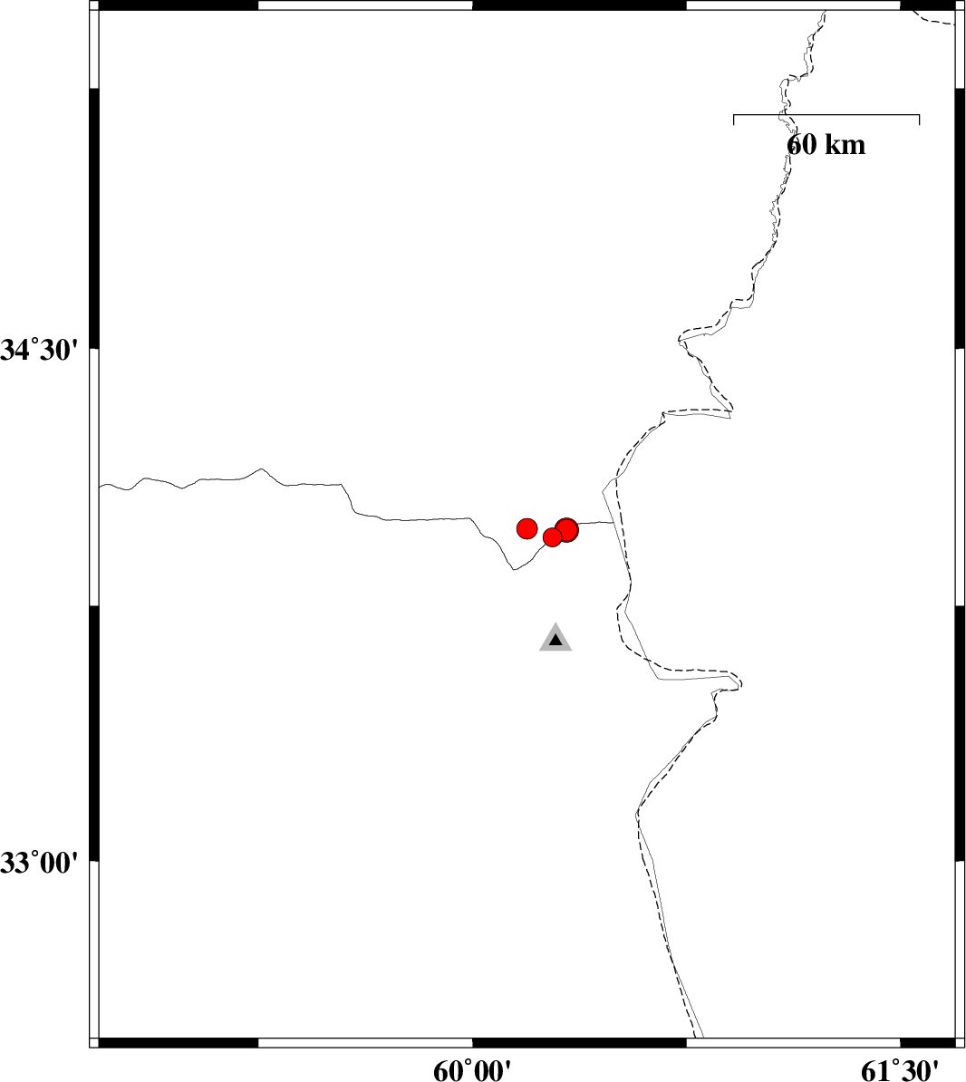 | 2020/08/07 | 14:46:01.2 | 19:16:01.2 | 33.975 | 60.191 | 18 | ML:3.3 | Khorasan(center) Province, 66 km South of Khaf | ||