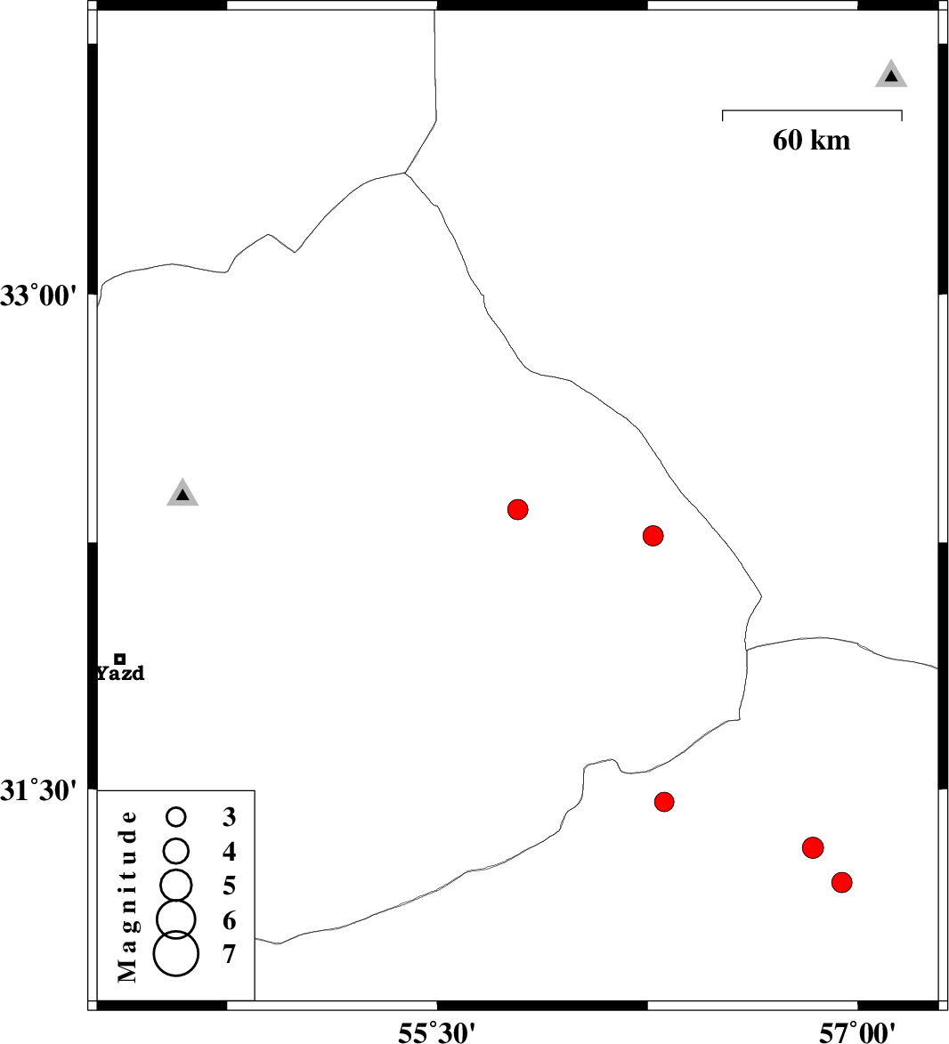 | 2020/07/19 | 01:15:27.5 | 05:45:27.5 | 32.27 | 56.27 | 24 | ML:3.2 | Yazd Province, 111 km North-East of Bafq |