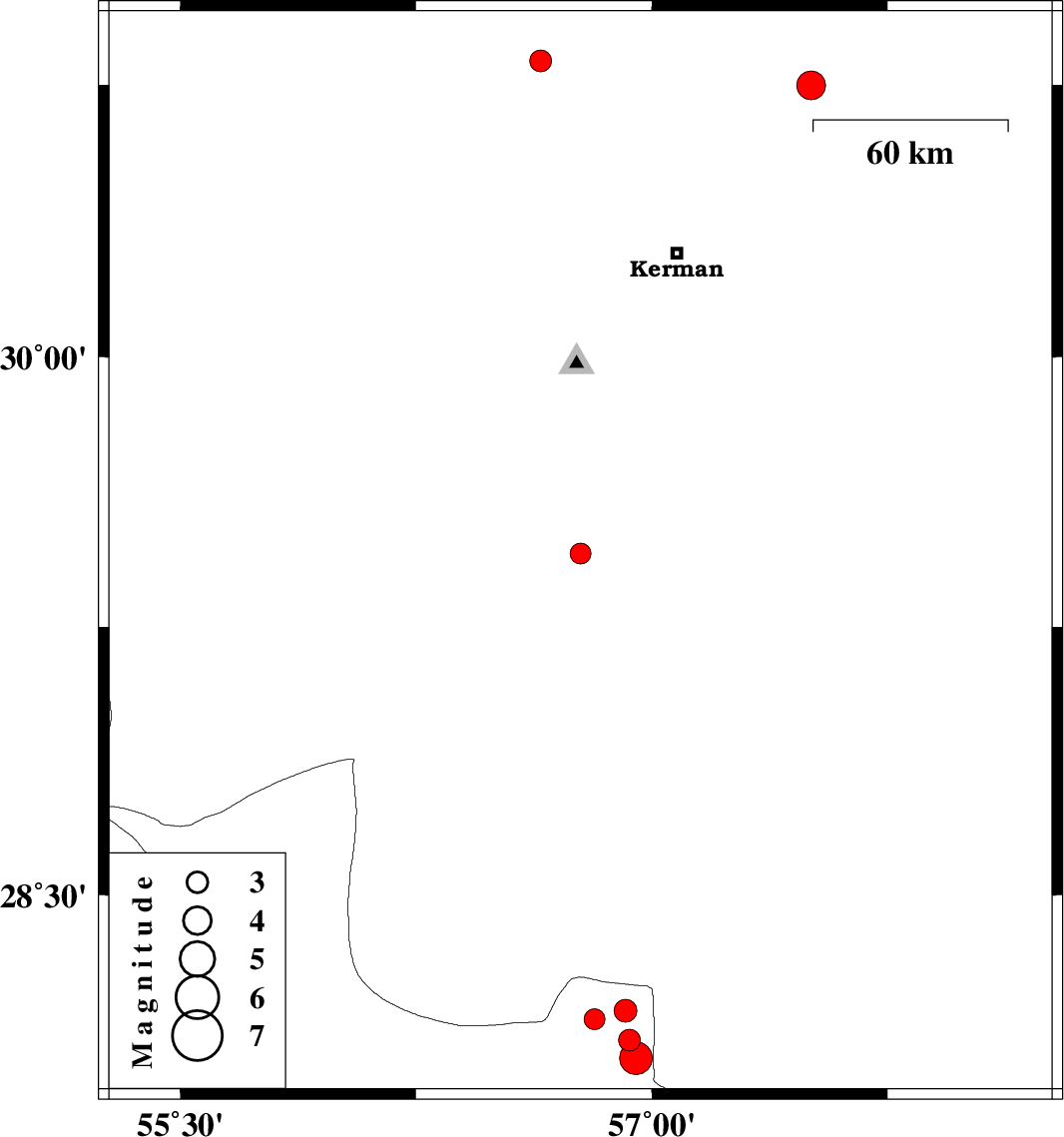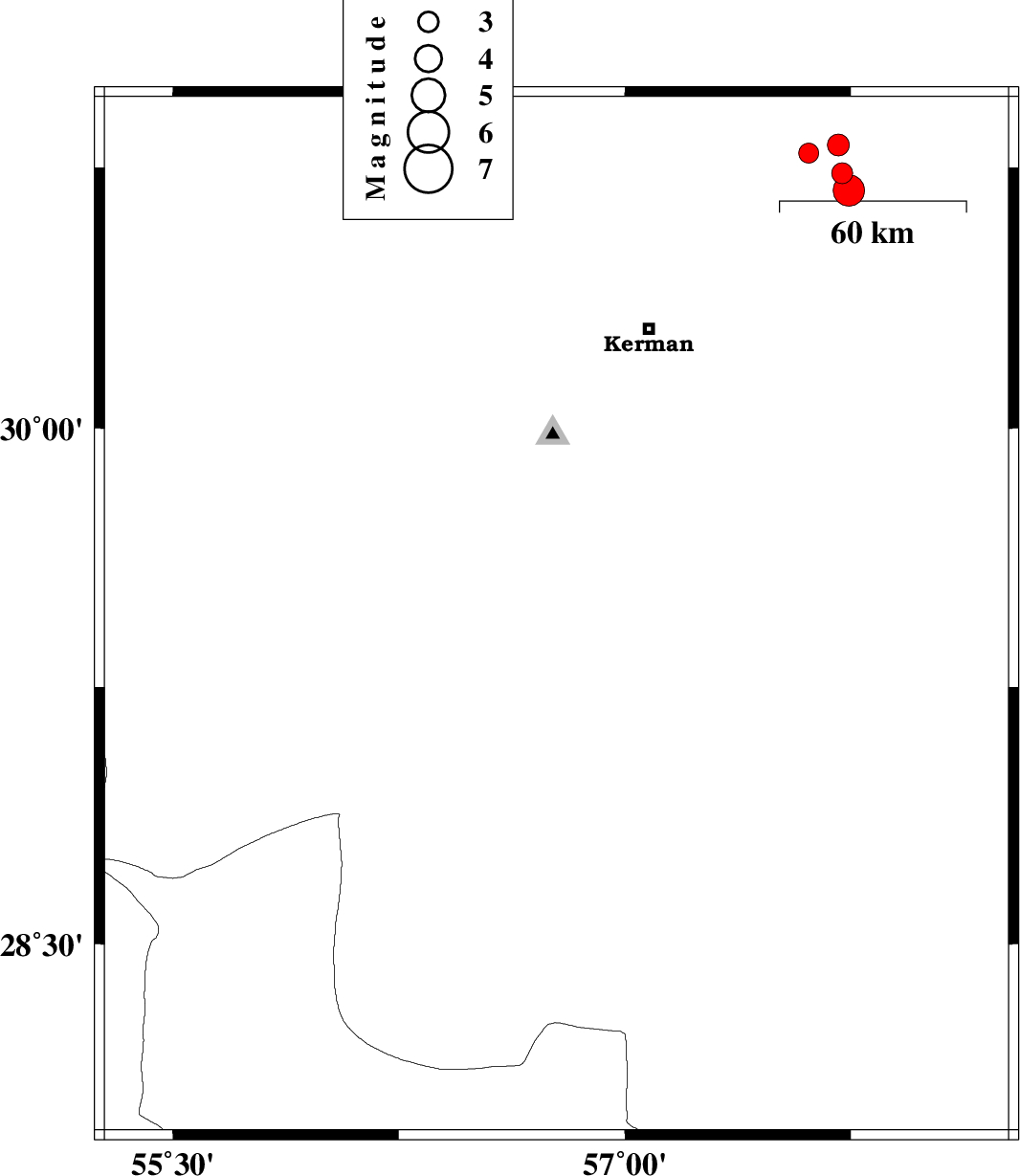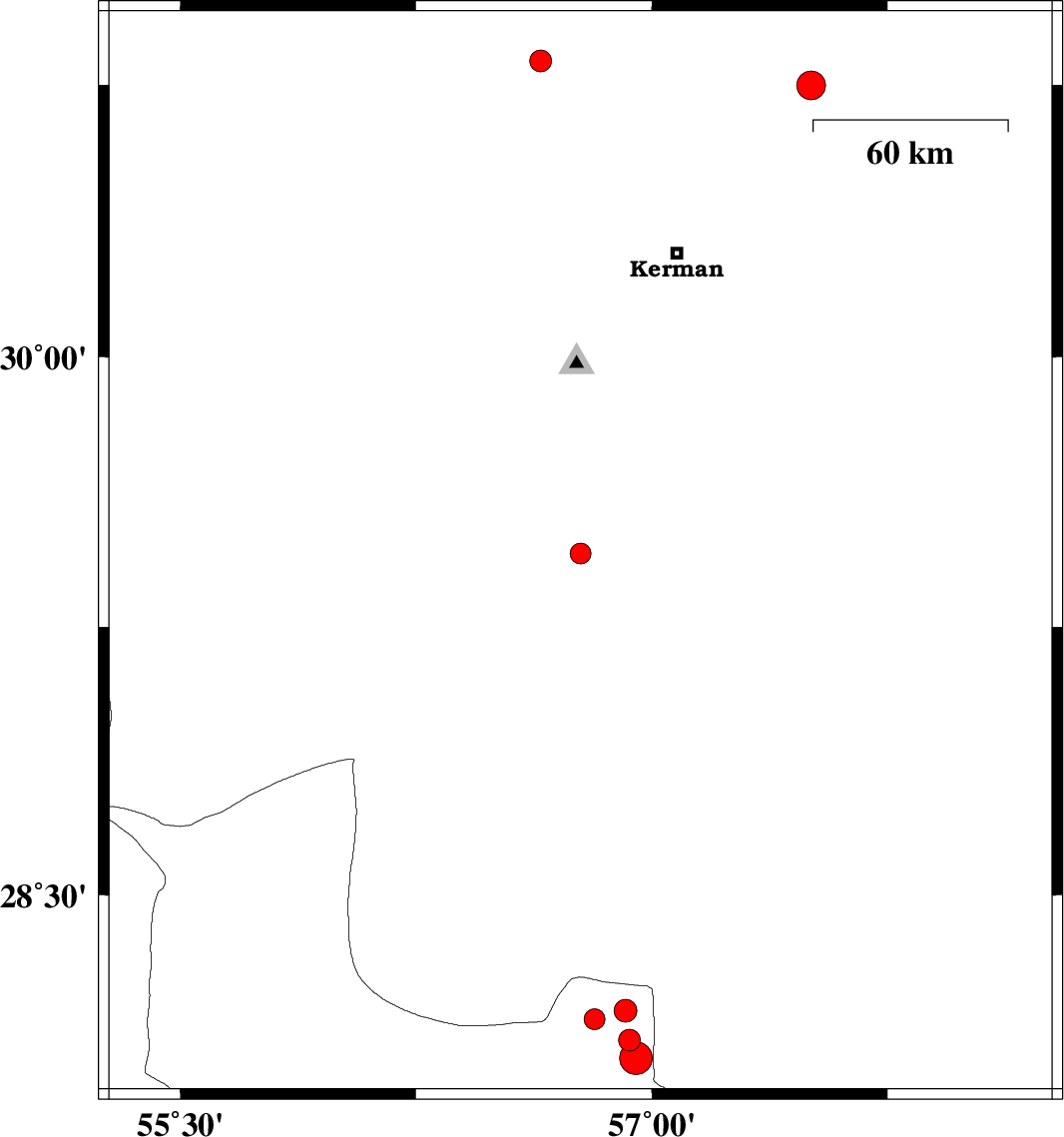 | 2020/08/05 | 18:55:03.8 | 23:25:03.8 | 30.749 | 57.507 | 12 | ML:4.1 | Kerman Province, 66 km North-East of Kerman |