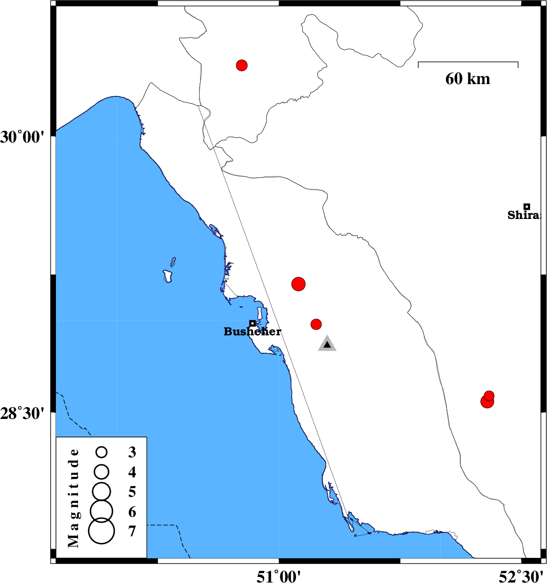 | 2020/06/28 | 00:34:48.6 | 05:04:48.6 | 28.98 | 51.23 | 10 | ML:3 | Bushehr Province, 12 km North of Ahram | ||