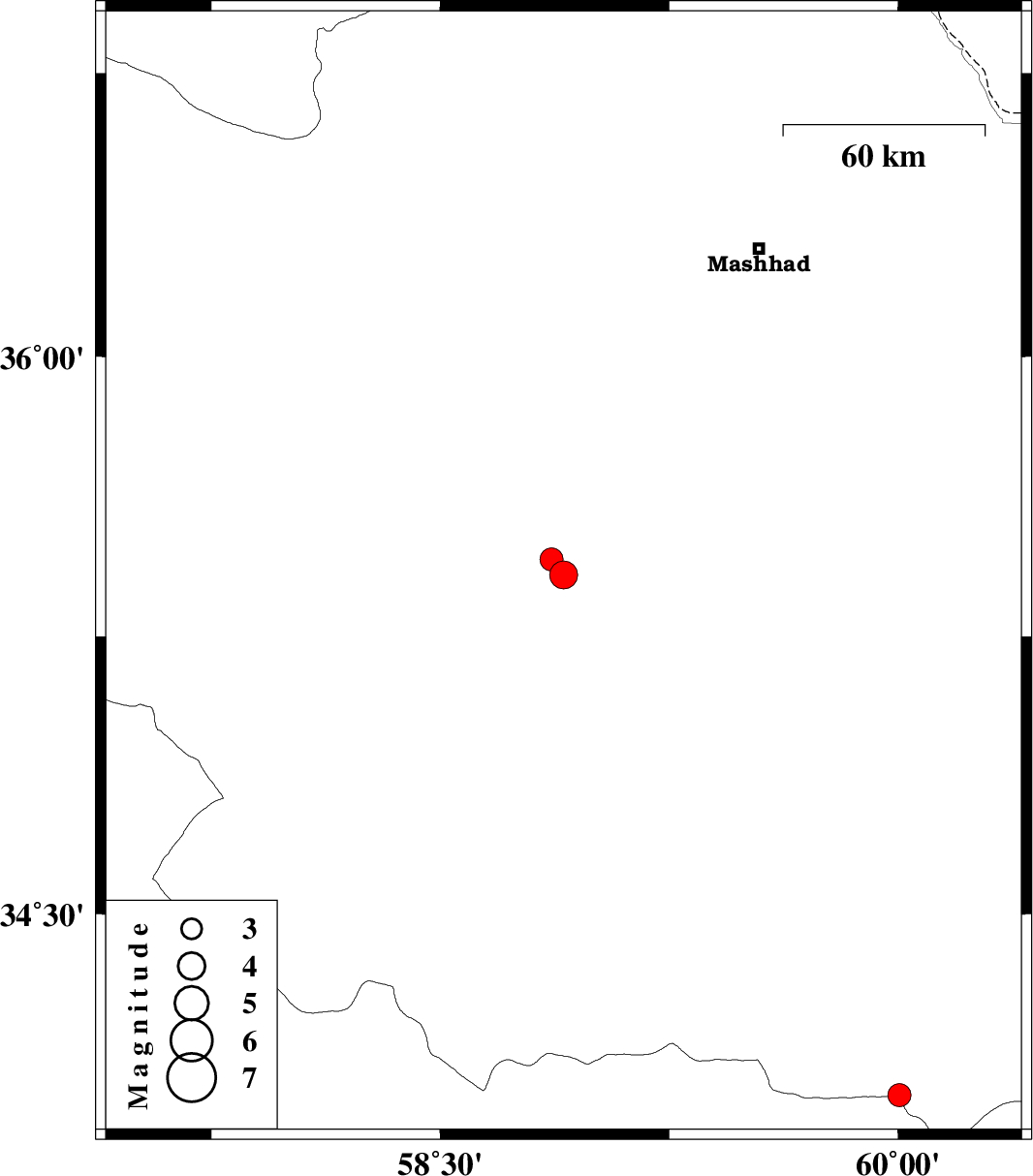 | 2024/10/29 | 16:53:44.8 | 20:23:44.8 | 35.457 | 58.864 | 10 | ML:3.4 | Khorasan(center) Province, 38 km North-West of Torbat-e heydariyeh |