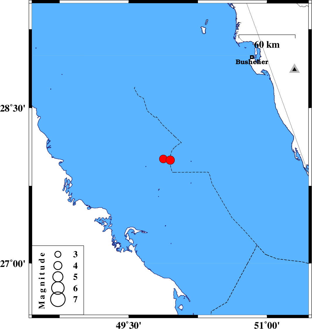 | 2024/10/29 | 23:20:44.7 | 02:50:44.7 | 28.009 | 49.875 | 12 | ML:3.9 | Persian Gulf |