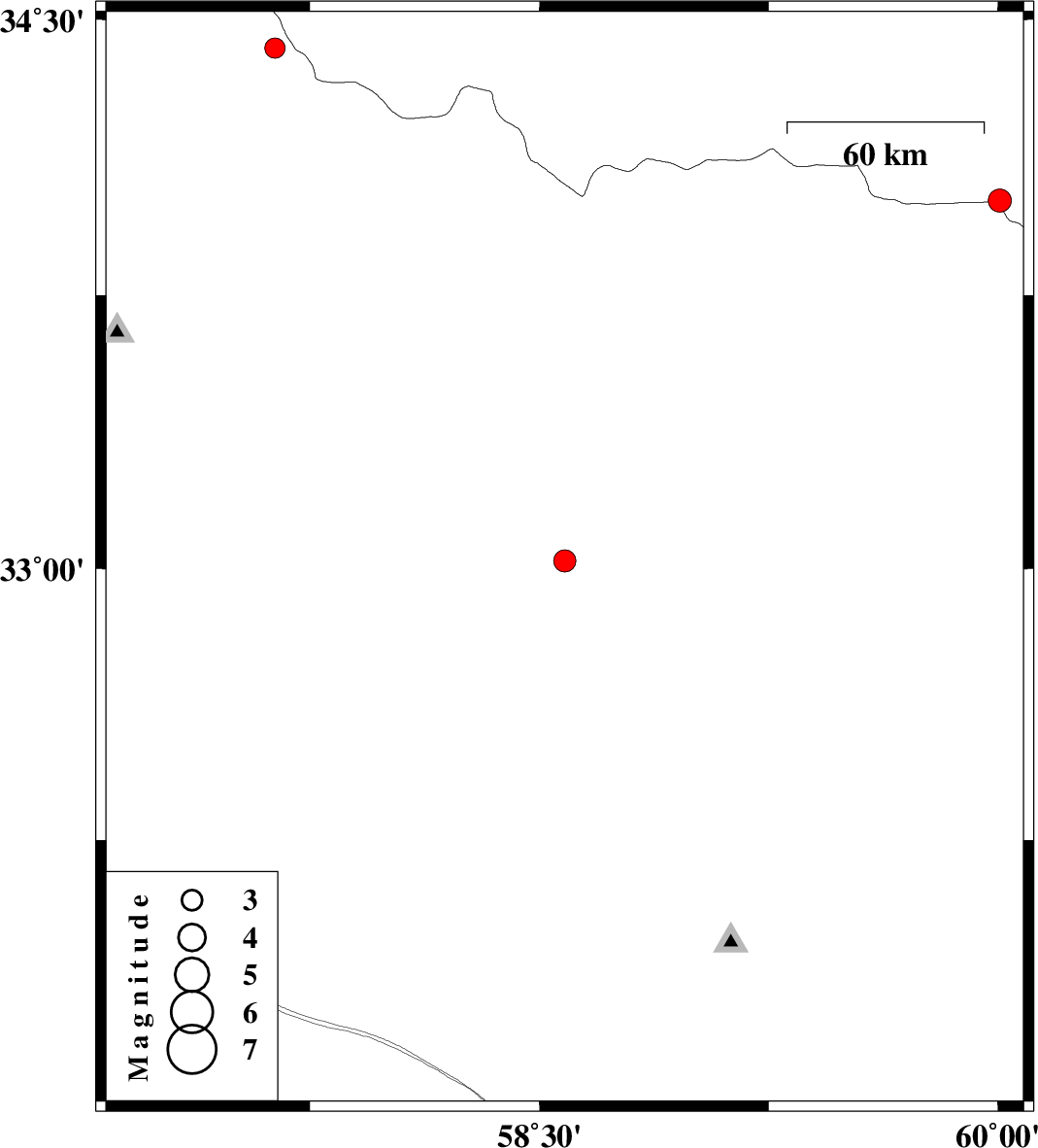 | 2024/11/13 | 05:57:32.6 | 09:27:32.6 | 33.022 | 58.583 | 12 | ML:3.3 | Khorasan(south) Province, 62 km North-West of Birjand | ||