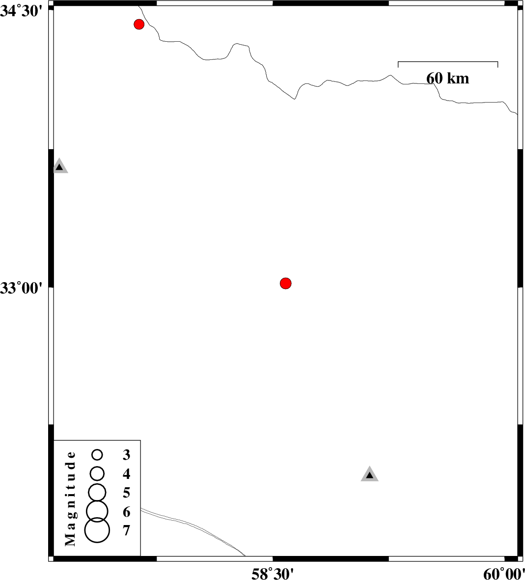 | 2024/11/13 | 05:57:32.6 | 09:27:32.6 | 33.022 | 58.583 | 12 | ML:3.3 | Khorasan(south) Province, 62 km North-West of Birjand | ||
