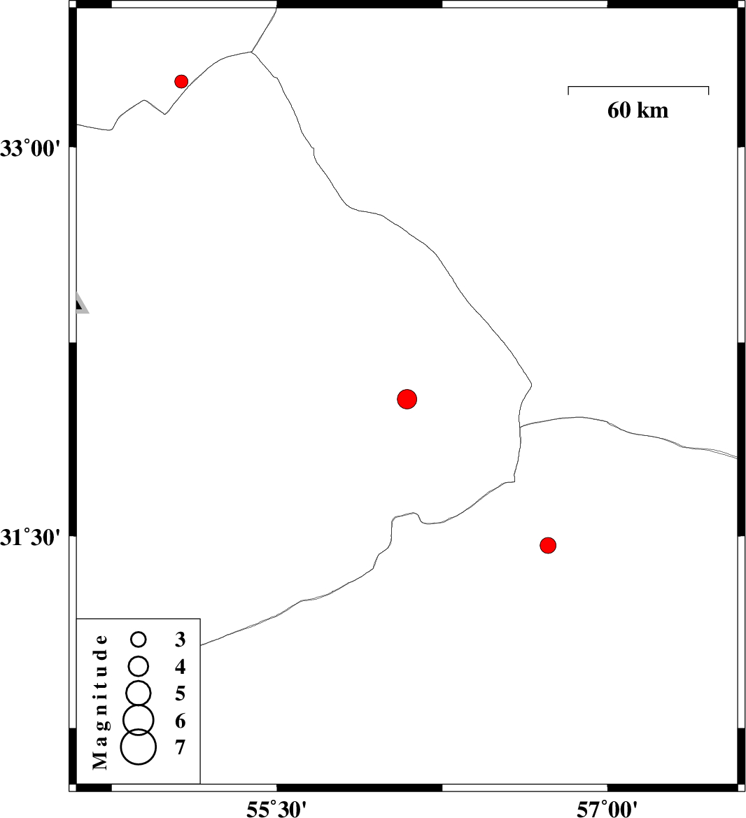 | 2024/11/10 | 22:17:55.9 | 01:47:55.9 | 31.463 | 56.73 | 10 | ML:3.2 | Kerman Province, 23 km North of Ravar |