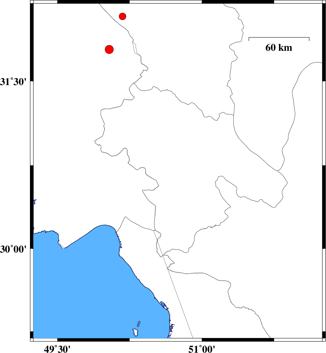 | 2024/11/08 | 04:01:46.4 | 07:31:46.4 | 30.791 | 50.059 | 10 | ML:3.1 | Khoozestan Province, 28 km North-West of Behbahan | ||