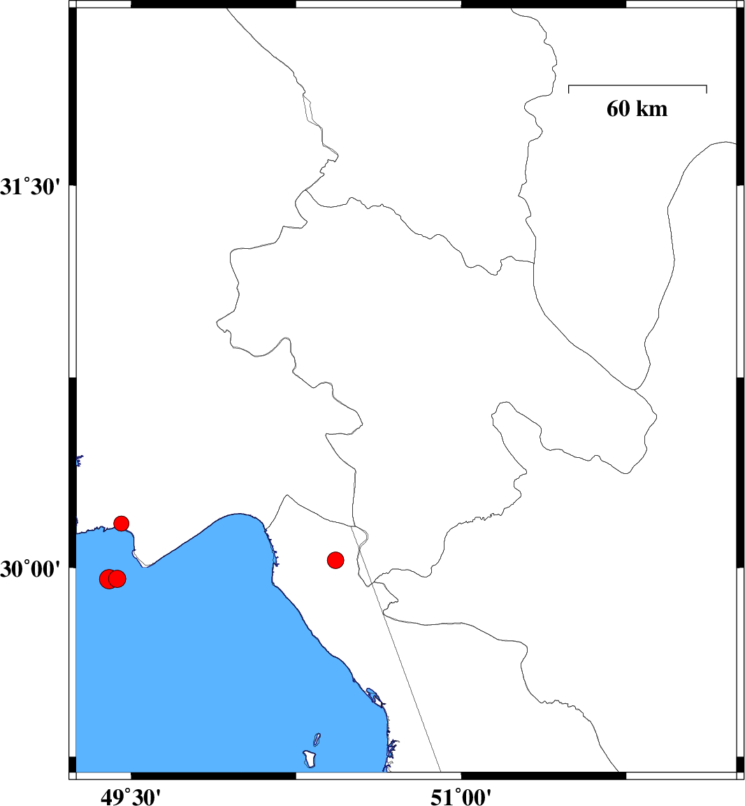 | 2024/11/08 | 04:01:46.4 | 07:31:46.4 | 30.791 | 50.059 | 10 | ML:3.1 | Khoozestan Province, 28 km North-West of Behbahan |