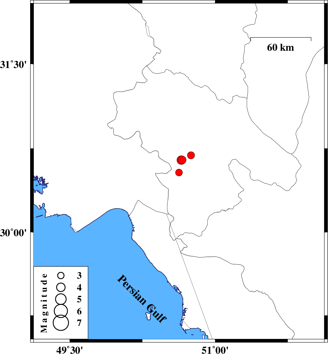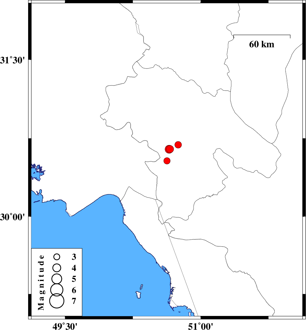 | 2024/11/15 | 00:15:16.7 | 03:45:16.7 | 30.646 | 50.651 | 12 | ML:4.1 | Kohkiluieh va boyerahmad Province, 18 km South of Dehdasht | ||