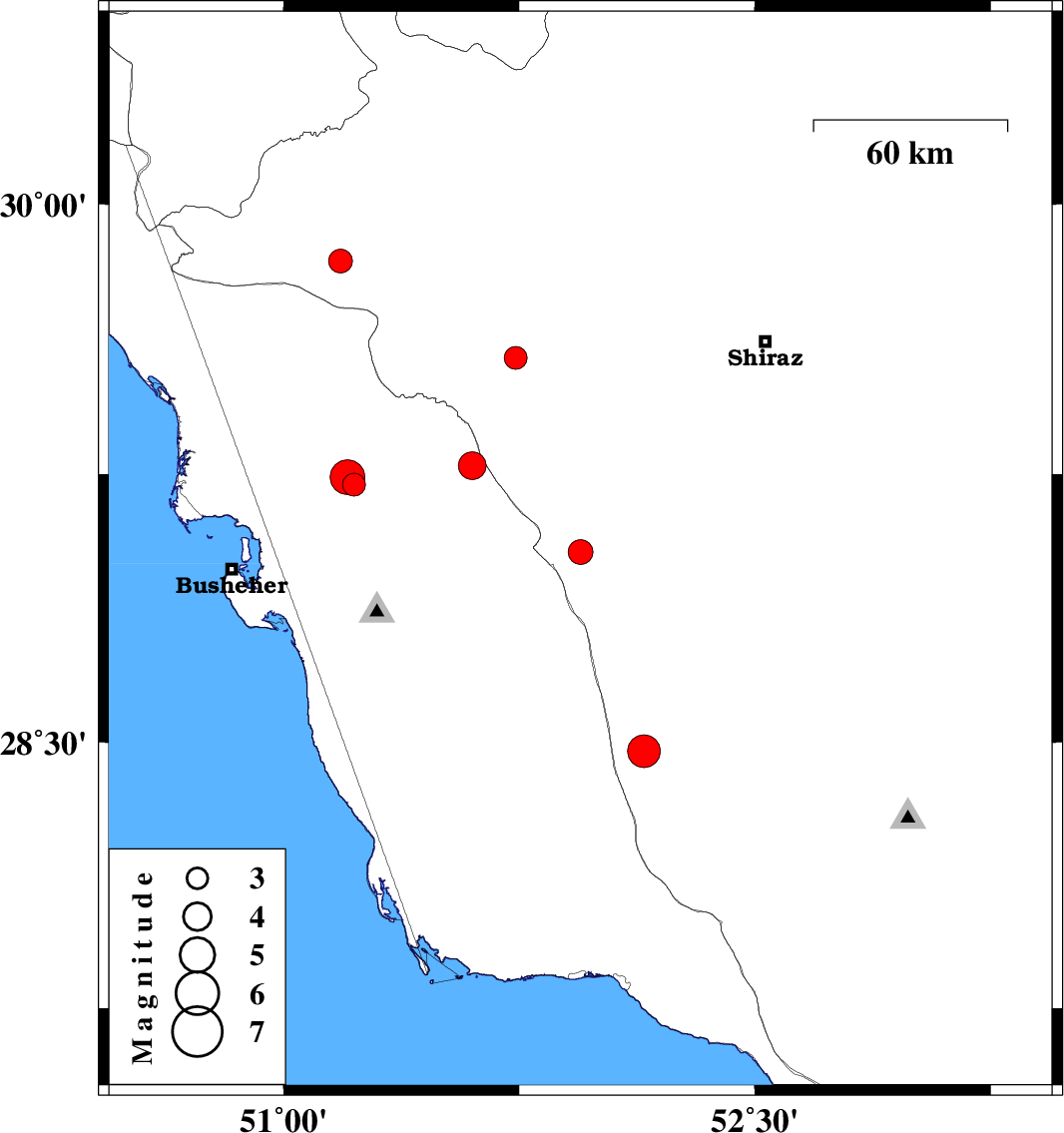 | 2024/10/24 | 00:38:42.3 | 04:08:42.3 | 28.474 | 52.147 | 12 | ML:4.7 | Fars Province, 45 km South of Farashband |