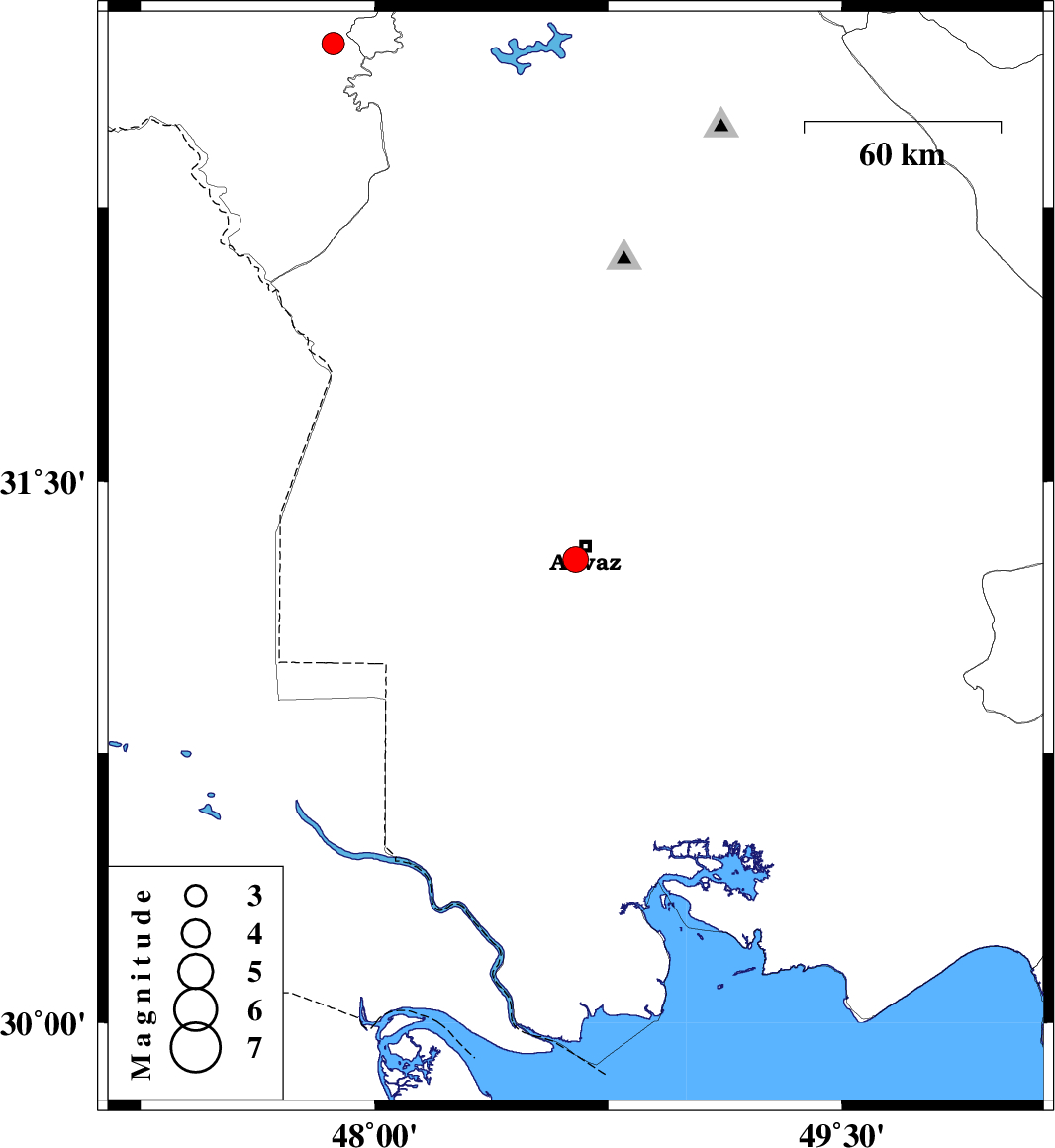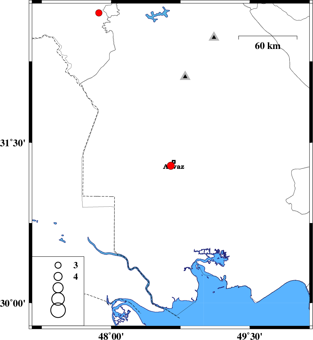 | 2024/11/28 | 21:59:51.6 | 01:29:51.6 | 31.284 | 48.645 | 14 | ML:3.7 | Khoozestan Province, 5 km of Ahvaz | ||