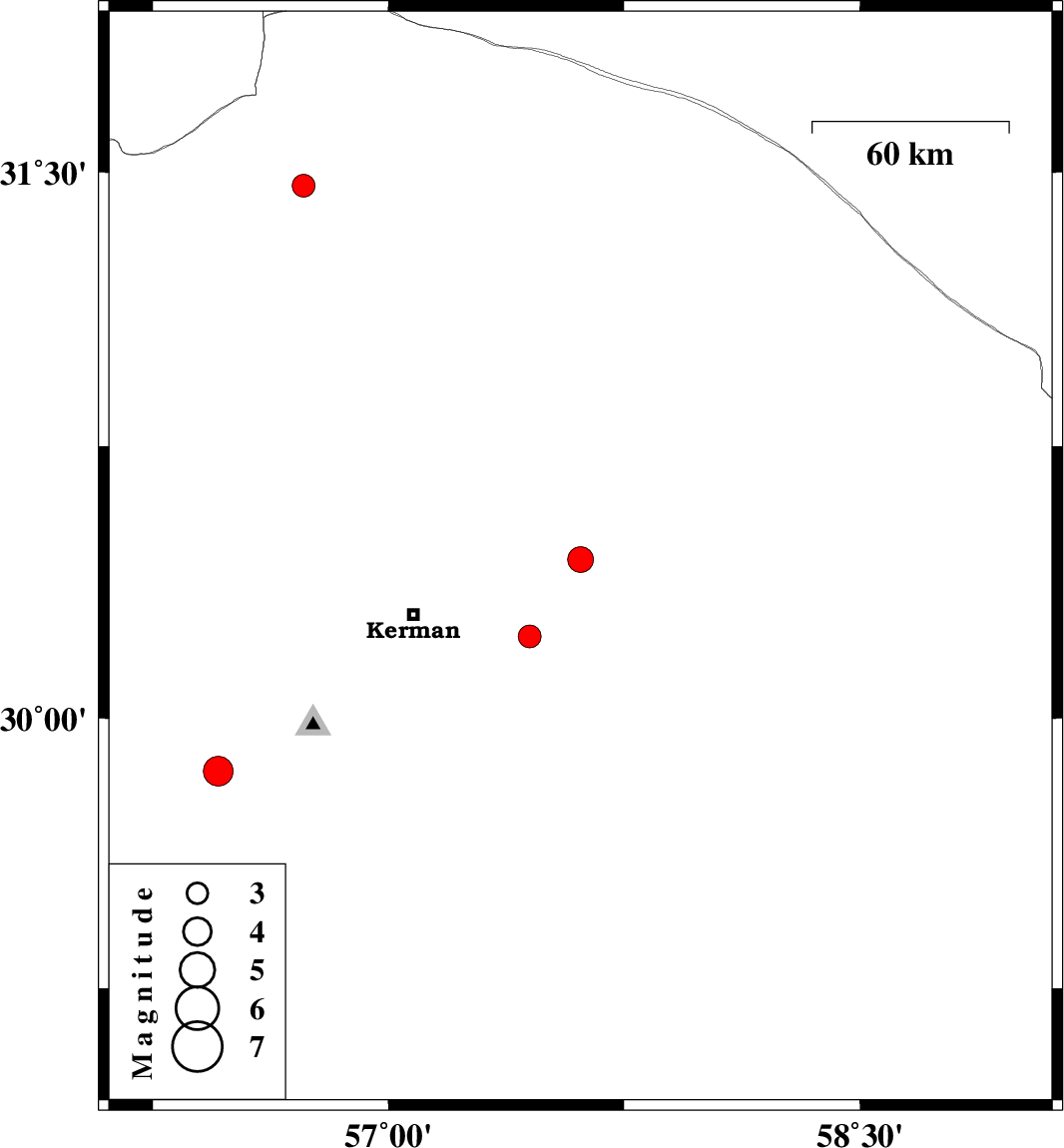 | 2024/11/30 | 19:01:53.8 | 22:31:53.8 | 30.439 | 57.611 | 12 | ML:3.7 | Kerman Province, 54 km North-East of Kerman | ||