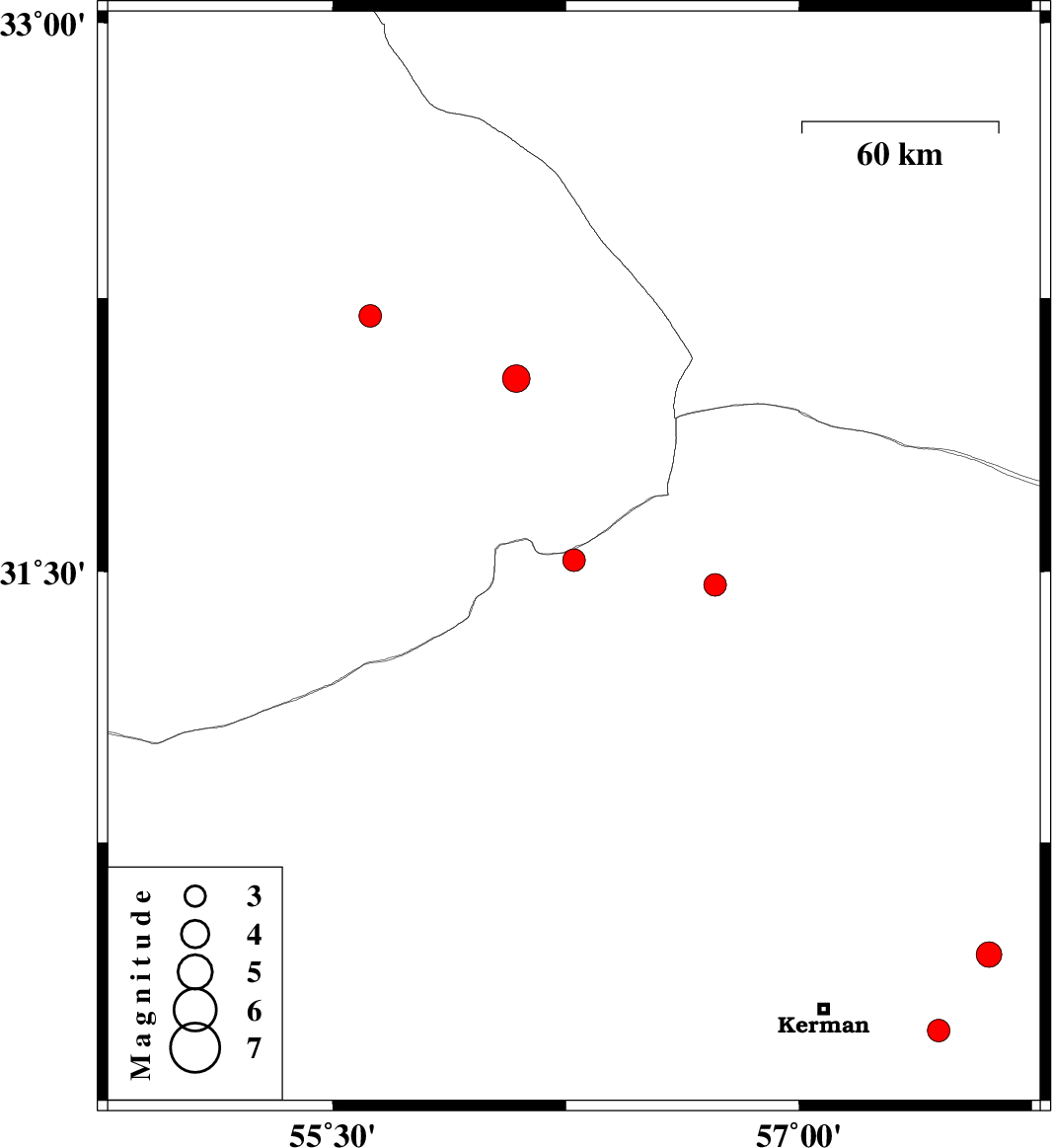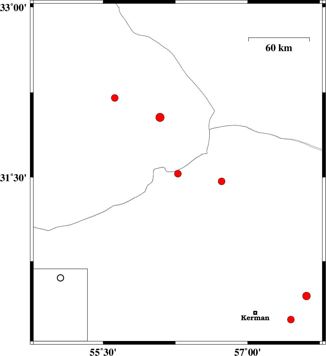 | 2024/11/10 | 22:17:55.9 | 01:47:55.9 | 31.463 | 56.73 | 10 | ML:3.2 | Kerman Province, 23 km North of Ravar | ||