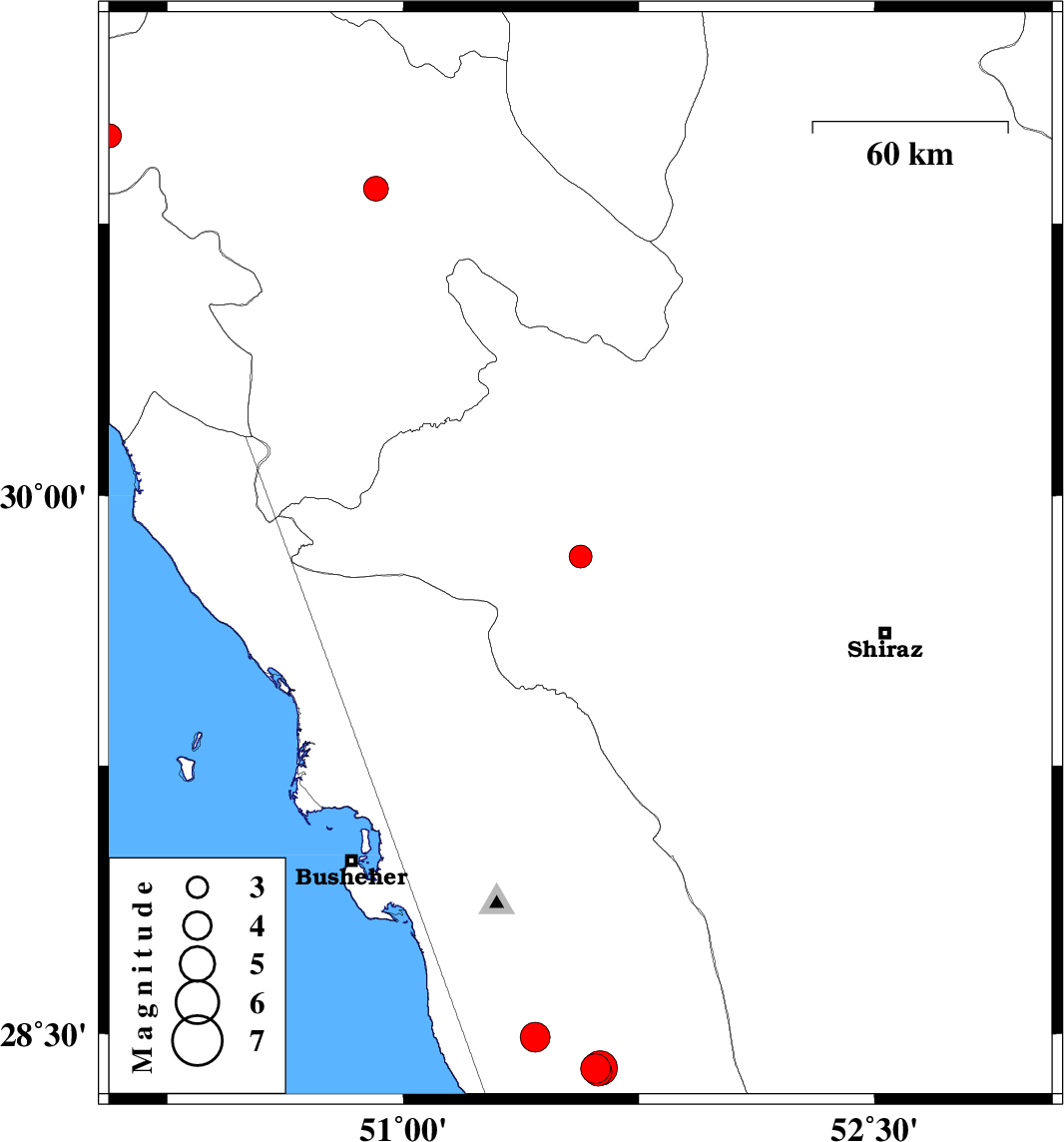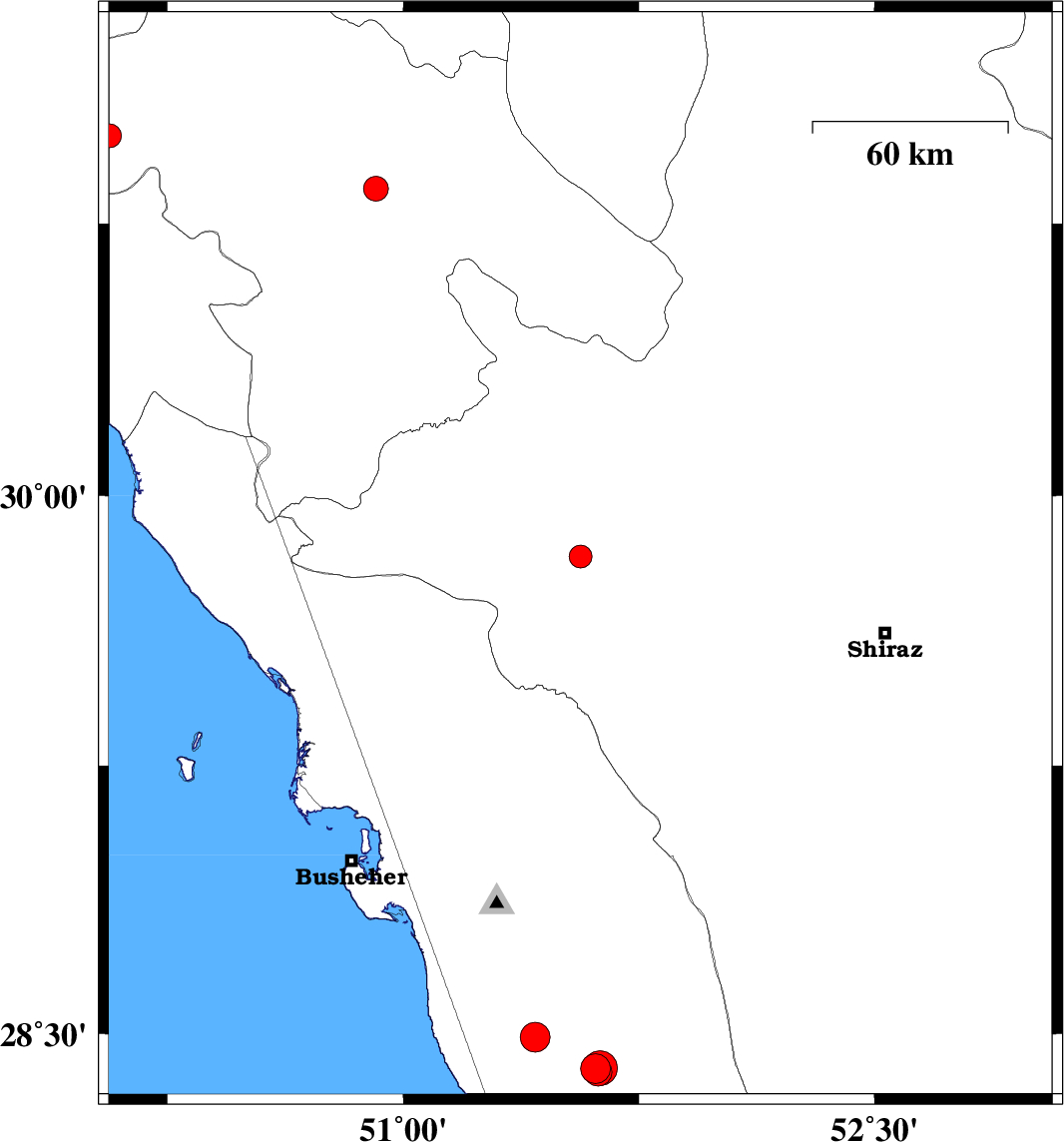 | 2024/12/05 | 13:25:58.2 | 16:55:58.2 | 28.403 | 51.626 | 22 | ML:4.9 | Bushehr Province, 37 km South-East of Khormog | ||