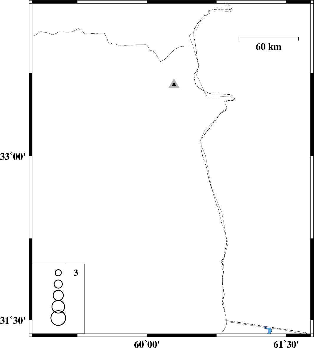 | 2024/12/20 | 23:31:40.2 | 03:01:40.2 | 32.874 | 60.262 | 12 | ML:4.3 | Khorasan(south) Province, 52 km North-East of Sarbisheh |