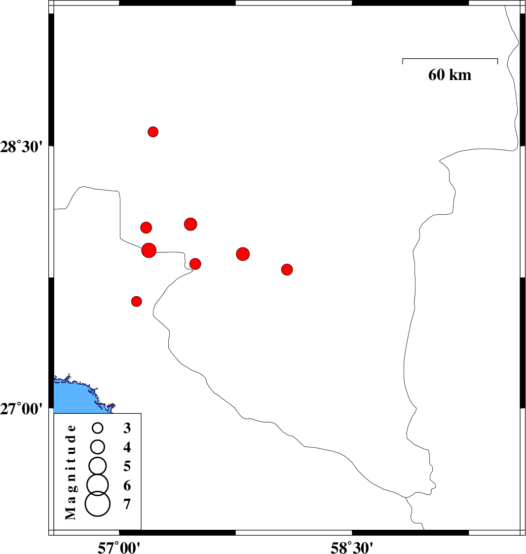 | 2025/01/01 | 17:10:49.6 | 20:40:49.6 | 27.796 | 58.08 | 12 | ML:3.3 | Kerman Province, 42 km South-East of Kahnuj | ||